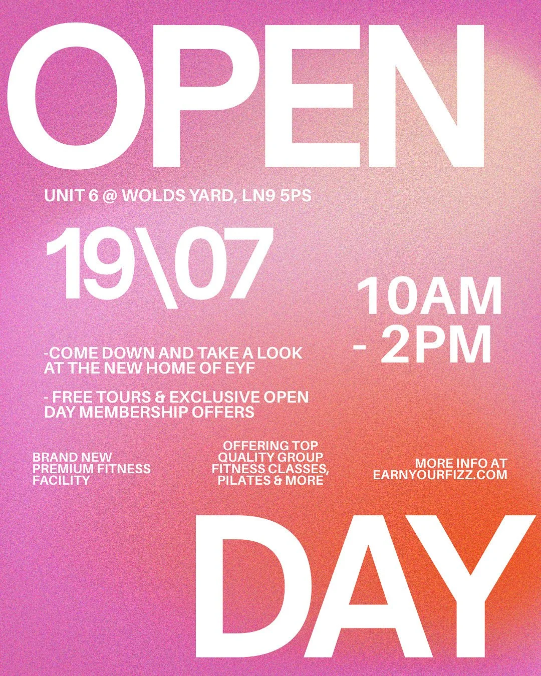 OPEN DAY SATURDAY 19TH JULY - 10 AM - 2PM! COME DOWN AND CHECK OUT THE SPACE, TAKE ADVANTAGE OF SOME EXCLUSIVE OPEN WEEKEND OFFERS AND GET EXCITED TO GET FIZZICAL IN YOUR BRAND NEW, PREMIUM FITNESS SPACE LOCATED IN WEST ASHBY, JUST OUTSIDE HORNCASTLE! WE CANNOT WAIT TO WELCOME YOU!